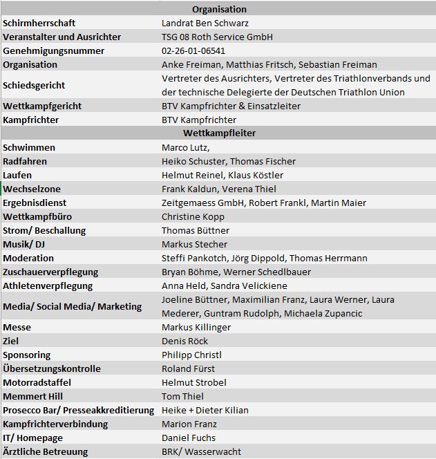 Mit der Anmeldung erklärt sich der Sportler damit einverstanden, dass Name und Bilder medial gratis und uneingeschränkt verwendet werden dürfen, soweit dies im Zusammenhang mit der Triathlonveranstaltung der TSG 08 Roth Service GmbH steht.
